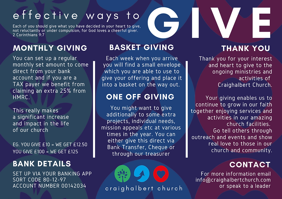 Our handout below provides useful information on how you can give to the ongoing ministry of Craighalbert Church